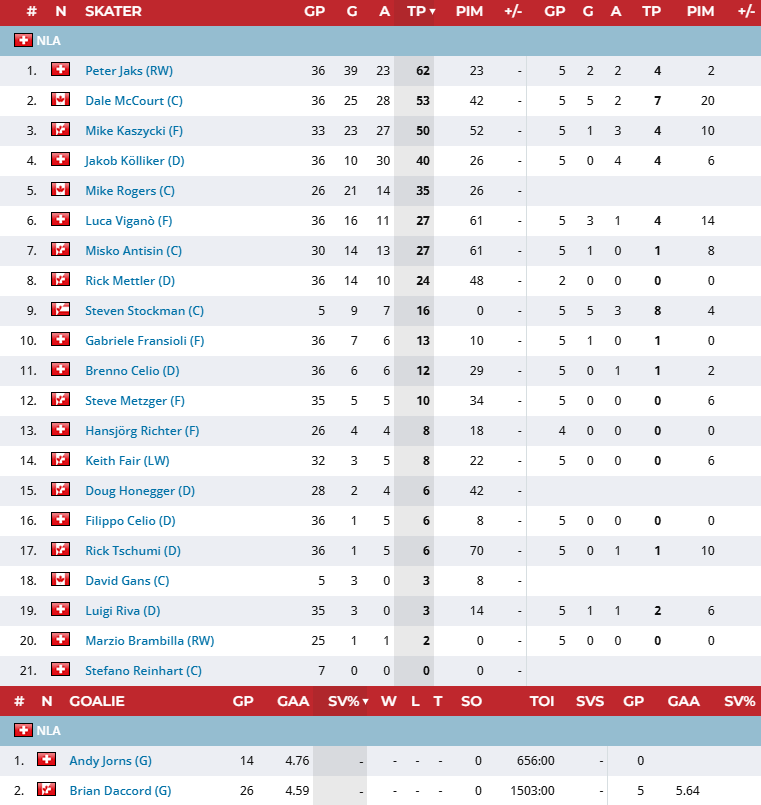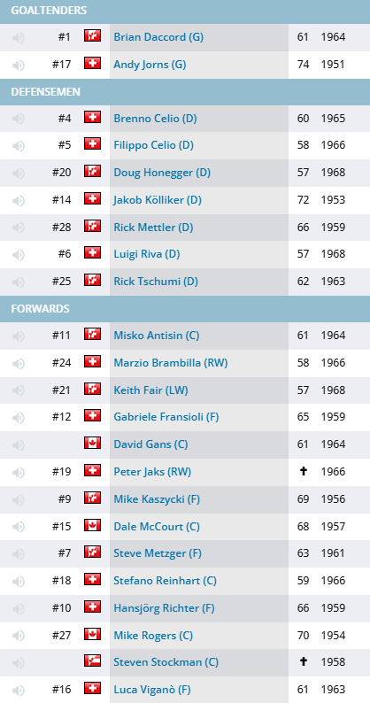Peter Jaks, Hansjürgen Richter (nuovo), Mike Kaszycki e Marzio Brambilla (nuovo). Manca Manuele Celio, trasferitosi al Kloten per motivi di studio. Gli stranieri sono tre: il riconfermatissimo Dale Me Court, il canadese Mike Rogers e il centro canadese Dave Gans. Prendono il posto di Don Red Laurence, lasciato partire (forse troppo presto) per Zugo, in serie B. In corso di stagione arriverà anche un altro giocatore griffato dalla foglia d'acero, Steve Stockman.