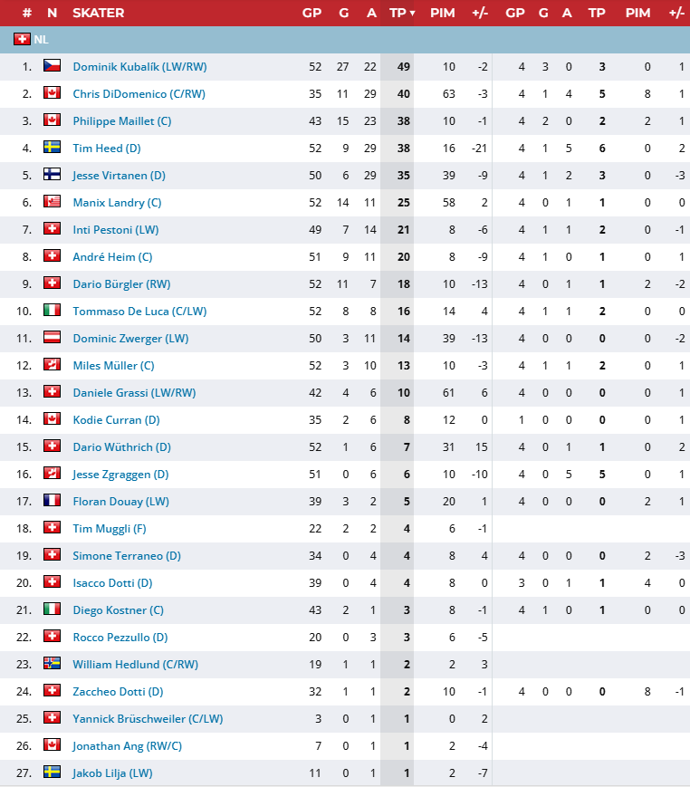 Stagione caratterizzata da movimenti di giocatori stranieri molto interessante. Dapprima la notizia che Kubalik non ricevendo un contratto in NHL ritorna ad Ambrì, Club che gli permise il salto in NHL anni orsono, e dopo un piccolo periodo di riambientamento contribuisce a suon di reti alla qualifica ai Play In. Altro movimento in corso di campionato, l'ingaggio di Chris DiDomenico (DiDo) dal Friborgo, che in cambio ingaggia dall'Ambrì Jakob Lilja. DiDo dimostzra subito la sua carica agonistica ed in linea con Maillet e Kubalik forma la Super linea che trascina l'Ambrì a soun di reti alla qualifica ai Play In. Tra gli stranieri vi è inoltre da segnalare l'ingaggio del difensore Curran e la partenza di Jonathan Ang per la Finlandi all' HV71.